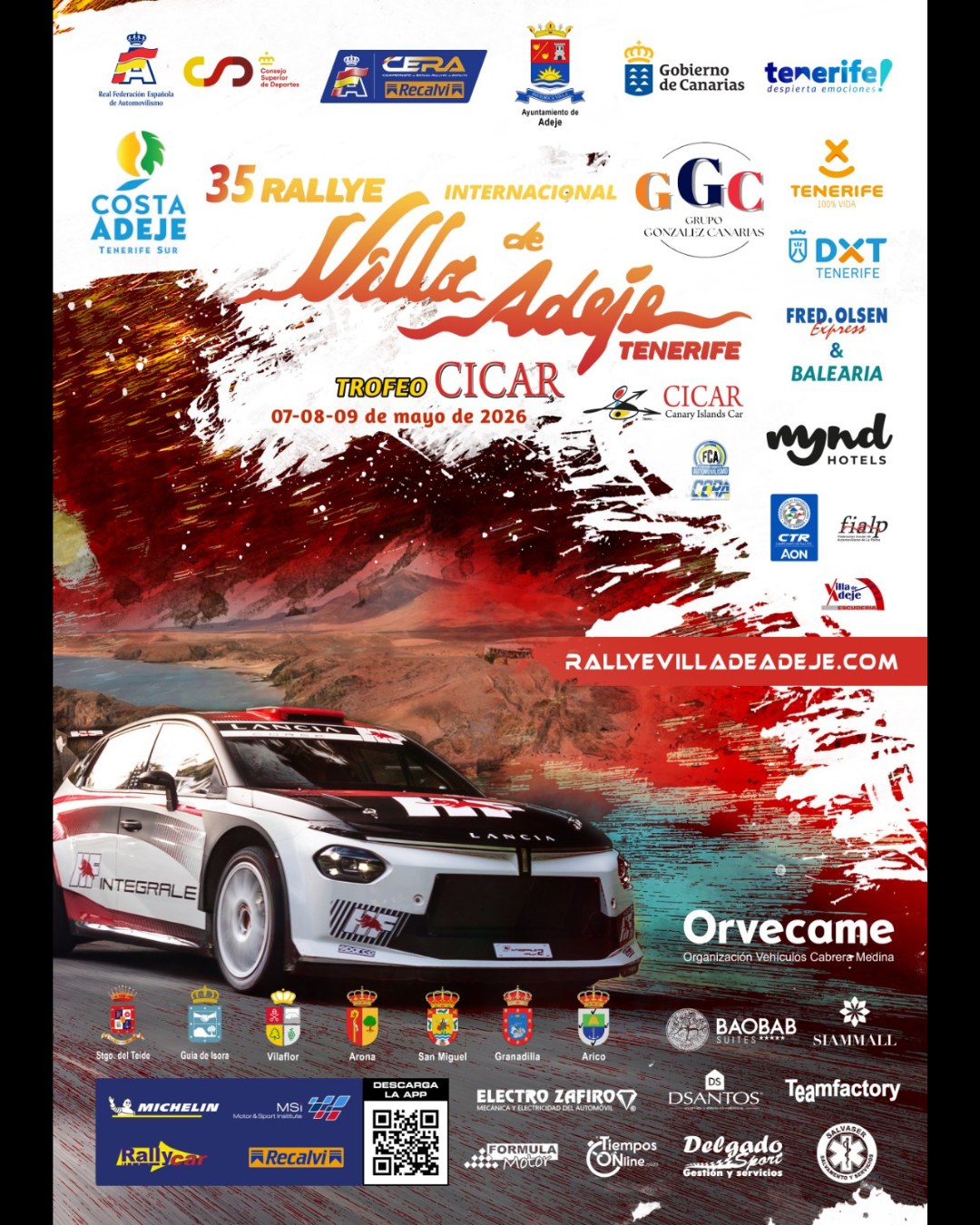 En el cartel oficial de la segunda cita del Campeonato de España de Rallyes de Asfalto, su autor, Juan José Llanos, fusiona automovilismo y turismo mediante la combinación de las imágenes de un hermoso paisaje de Costa Adeje y un Lancia Ypsilon Rally2 HF Integrale, vehículo con el que la mítica marca italiana, ahora representada en Canarias por el Grupo Orvecame, ha regresado a la competición.