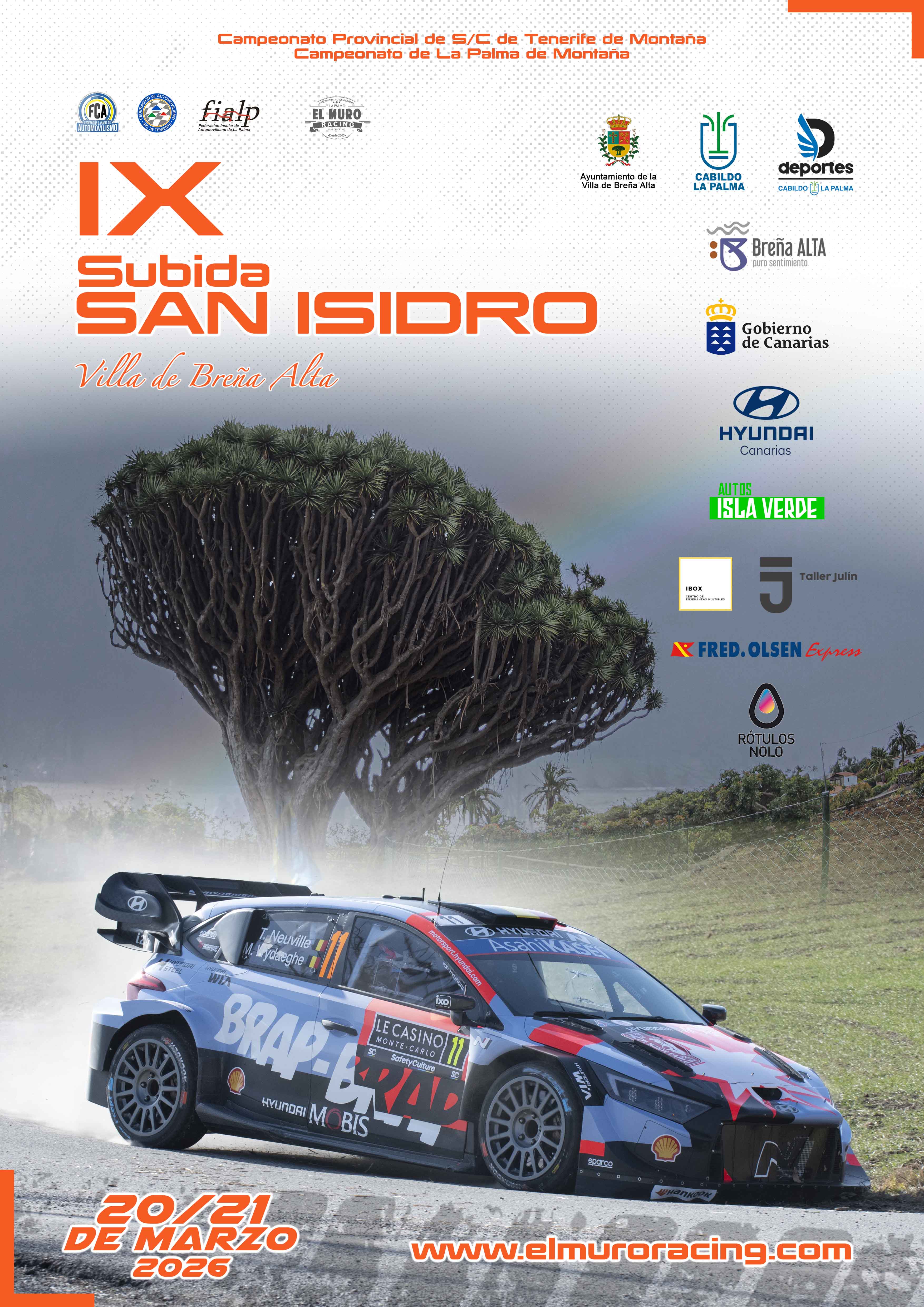 El Muro Racing engrana la primera velocidad de la IX Subida San Isidro, la primera prueba de asfalto en la Isla Bonita. Fijada en 2026 para los días 20 y 21 de marzo, formará parte del calendario provincial e insular de la especialidad de montaña. La Villa de Breña Alta, donde se desarrolla esta competición, volverá a vibrar con una rampa que ya se ha consolidado en el calendario.